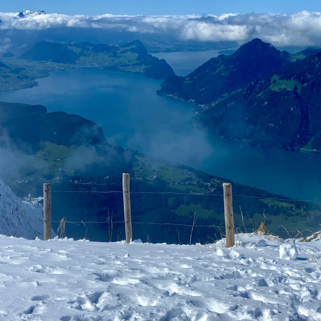 From the village center, it’s just a five-minute walk to the Fronalpstock chairlift station. Two consecutive chairlifts take you to the summit at 1,922 meters. The Fronalpstock Panorama Trail is an easy 1.5 km loop, perfect for families and children of all ages. With mostly flat terrain, gentle inclines, and sweeping views of Lake Lucerne and the surrounding peaks, the trail takes about 30–60 minutes to complete. Conveniently, it begins and ends near the playground and summit restaurant, which offers both indoor and outdoor seating with local dishes. The observation deck at the top provides a breathtaking panorama of ten lakes and countless peaks.