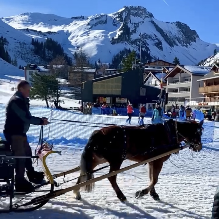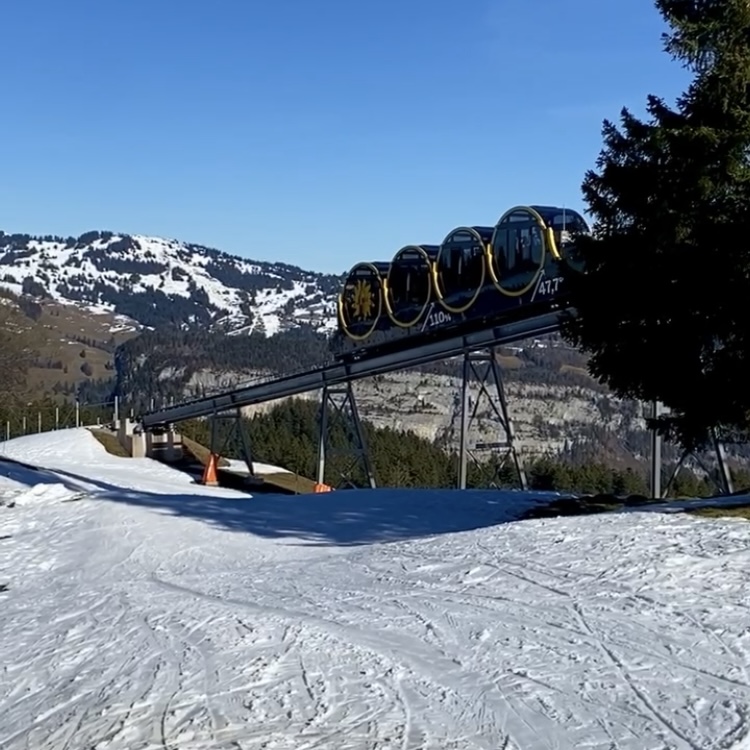 Tobogganing is a beloved Swiss winter pastime, and Stoos offers a thrilling 2 km run from the Fronalpstock summit to the middle chairlift station, descending 397 meters. Wooden sleds can be rented at the middle station; you carry them up the chairlift to the summit and then follow the purple-marked trail. The route crosses a few ski slopes, so caution is advised. The run can be repeated as many times as you like before returning the sleds. For us, it was more challenging than expected and better suited to adults and older children. For younger kids, there’s a bunny slope with a magic carpet in Stoos village—a safe and fun introduction to sledding.