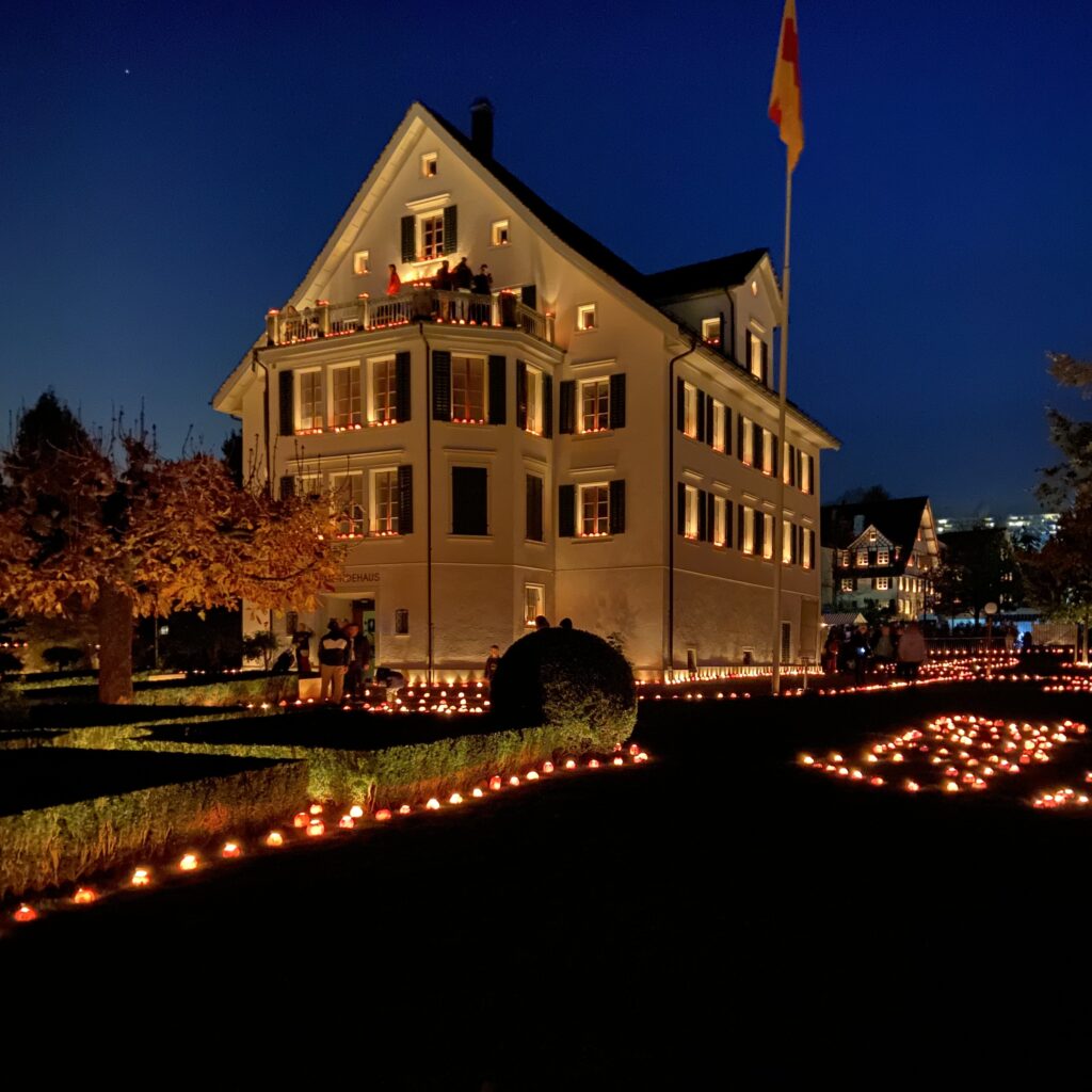Another magical Swiss fall tradition is Räbechilbi, where turnips are carved into lanterns and carried through the streets at night. While small towns across Switzerland host their own parades in November, the largest celebration is in Richterswil on Lake Zurich. The entire town glows with thousands of lanterns. The main event is a spectacular parade featuring intricately carved turnips decorating large floats. Families should plan to arrive by train, as parking is very limited, and bring cash to purchase parade badges (entrance tickets) from children at the station. Food stalls are available, but the lines are long, so we packed extra snacks. Although the parade route can get crowded, finding a spot near the end offers a better view and a little more breathing room for kids. At the end of the parade, the floats are parked on the parade route to get a closer look. This unique festival is a truly magical family experience in Switzerland during autumn.