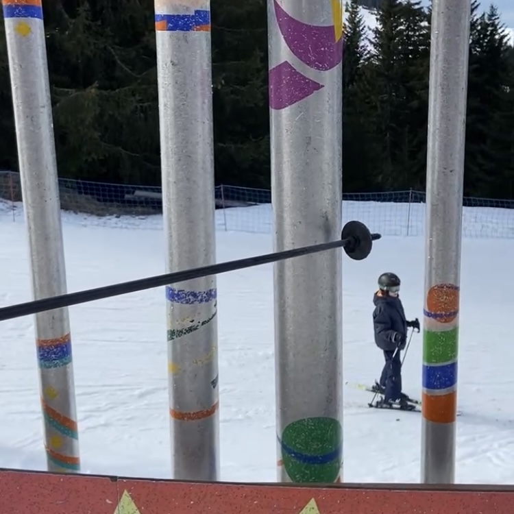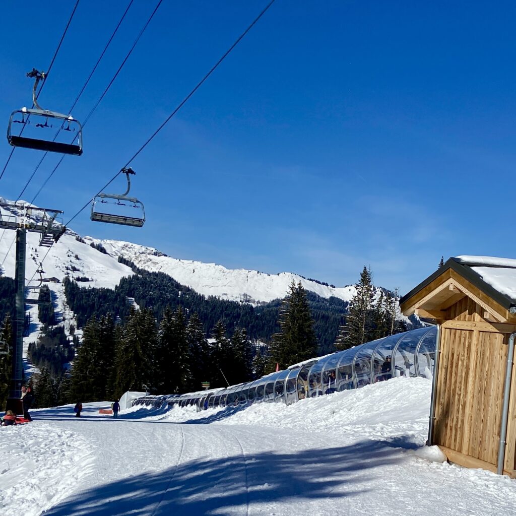 Les Gets is part of the larger Portes du Soleil ski area, which stretches across France and Switzerland with over 600km of slopes. While it is possible to ski across borders, we usually stay within the Les Gets section, which has plenty to offer families. From the center of town, it’s easy to hop on the Chavannes cable car—a convenient option when traveling with young children. At the top, beginners can practice on the short bunny slope equipped with a magic carpet, though it can get busy during peak school holidays. Once our children were ready, we moved on to the Grand Cry Territory, a unique themed ski area with interactive beginner and intermediate trails. Kids can hit objects with their ski poles, weave through tunnels, play instruments, and even dodge fun obstacles. With its Western theme, it’s a highlight of skiing in Les Gets for younger children and keeps them motivated on the slopes.
