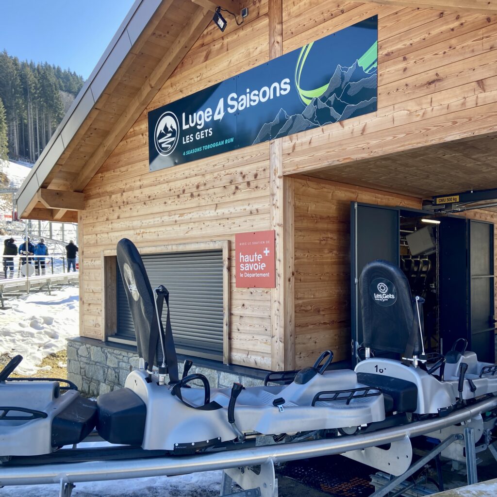 Another highlight in Les Gets is the Luge 4 Saisons, an alpine coaster that runs year-round. The 1,100-meter track winds down the mountain at thrilling speeds of up to 40 km/h and is a family favorite. Each sled holds two people, so adults can ride with younger children. Kids ages 3–7 must ride with an adult, while children 8 and older (at least 1.35 m tall) can ride on their own. Afterward, don’t miss the souvenir photo—available as both a print and a digital copy—which our kids love. Next to the coaster is a family-friendly restaurant with indoor and outdoor seating overlooking the track. The menu features burgers, sandwiches, salads, ice cream, crêpes, and a kids’ menu with favorites like chicken nuggets. Free parking is also available at the Perrières car park.