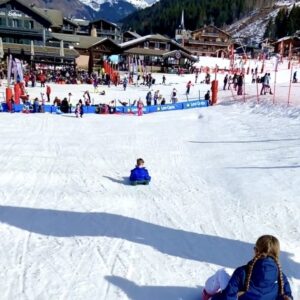 Sledding hill in Les Gets village, free and fun winter activity for kids near the ski lifts.