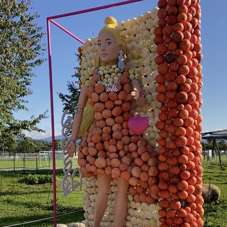 Every year the pumpkin displays follow a new theme, and they get more impressive each season. In 2024, the theme was “Big Cinema,” which featured remarkable sculptures including the mammoth and sloth from Ice Age. This year in 2025, the theme is “Let’s Play,” and our favorites have been Barbie and Lego. Visitors walk along a stroller-friendly wooden path to view the creations, with bilingual signs in English and German describing each display. The scale and creativity of the sculptures make it a great outing for both kids and adults.