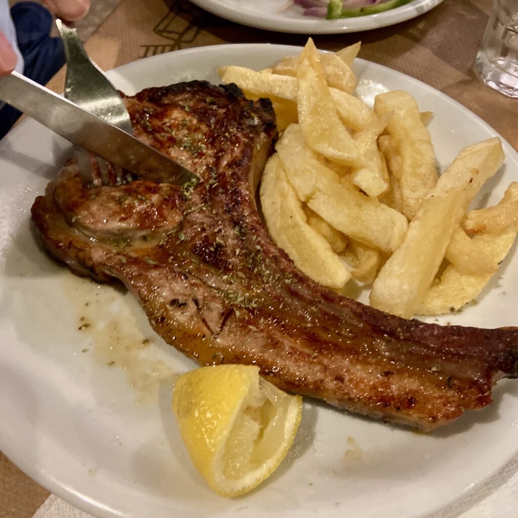 After exploring the tower, we headed to Καφέ-Οινομαγειρείο Η Δανάη, a traditional Greek taverna in the heart of the village. One of the biggest perks for families is the pedestrian-friendly square. Since cars are restricted in the center, our kids were able to run around and play safely while we waited for our meal.