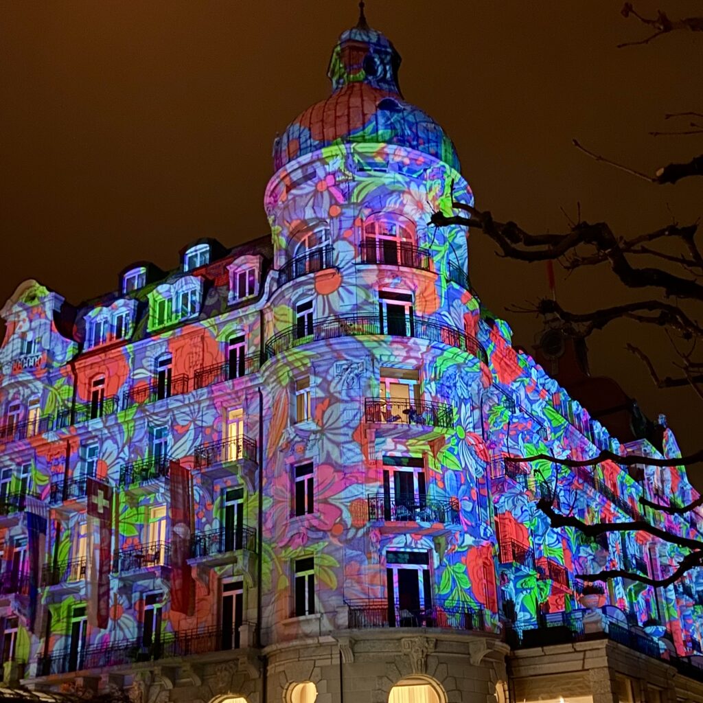 Our first visit to the Lilu Light Festival Lucerne was in 2024, when we purchased tickets for the Spiritus Light Show at Matthäuskirche in the Old Town. With our kids still quite young, we opted for one of the more affordable shows to gauge how they’d enjoy it. The 360-degree projection of lights and sound was beautiful—vivid visuals filled the church and were easy to appreciate from any seat. While our kids were fascinated at first, their attention eventually waned, so I was thankful to have packed a few snacks.