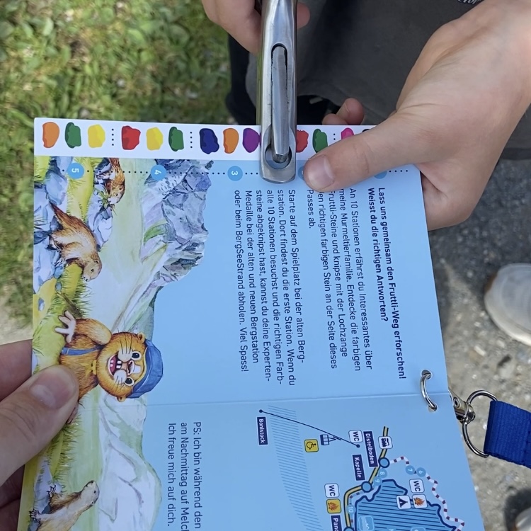 At the start, the kids picked up their trail map next to the marmot statue at the top cable car station. At each activity station, they used the provided hole puncher to record their answers. With the trail looping around a sparkling mountain lake and featuring only gentle inclines, it was comfortable for us adults and manageable for both children. Benches and picnic tables are scattered along the route, making it easy to stop for snacks or a lakeside lunch. While officially stroller-friendly, some rocky and narrow stretches can make pushing a stroller challenging.