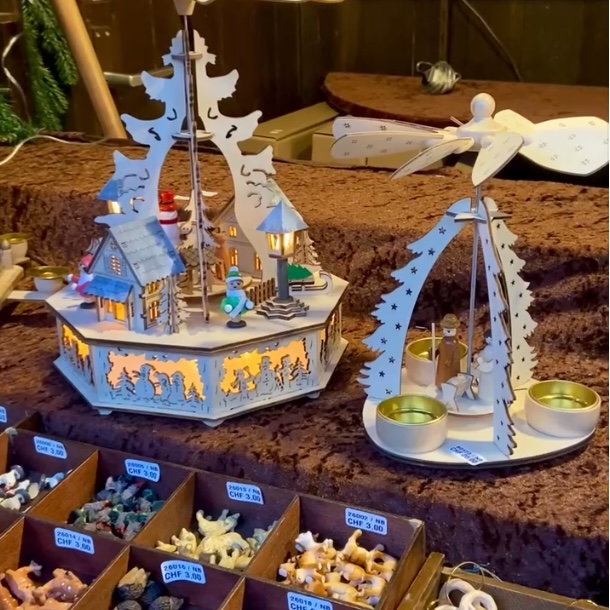 Our kids were immediately drawn to the carousel and had a blast playing with the bubbles floating around. We spotted a Christmas train and a dedicated kids’ activity area, but the lines were quite long, so we decided to skip those this time. The market was filled with tempting aromas of Raclette, sausages, and mulled wine. However, the lines were extensive, so we didn’t get a chance to sample any of these treats. A visit on a weekday or earlier in the day might be a better bet to avoid the crowds. We explored several charming stalls offering a delightful array of gifts, including jewelry, ornaments, and gemstones. We picked up some lovely ornaments, and my son was particularly fascinated by a stall showcasing various gemstones and rocks.