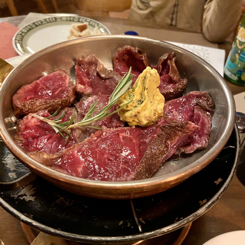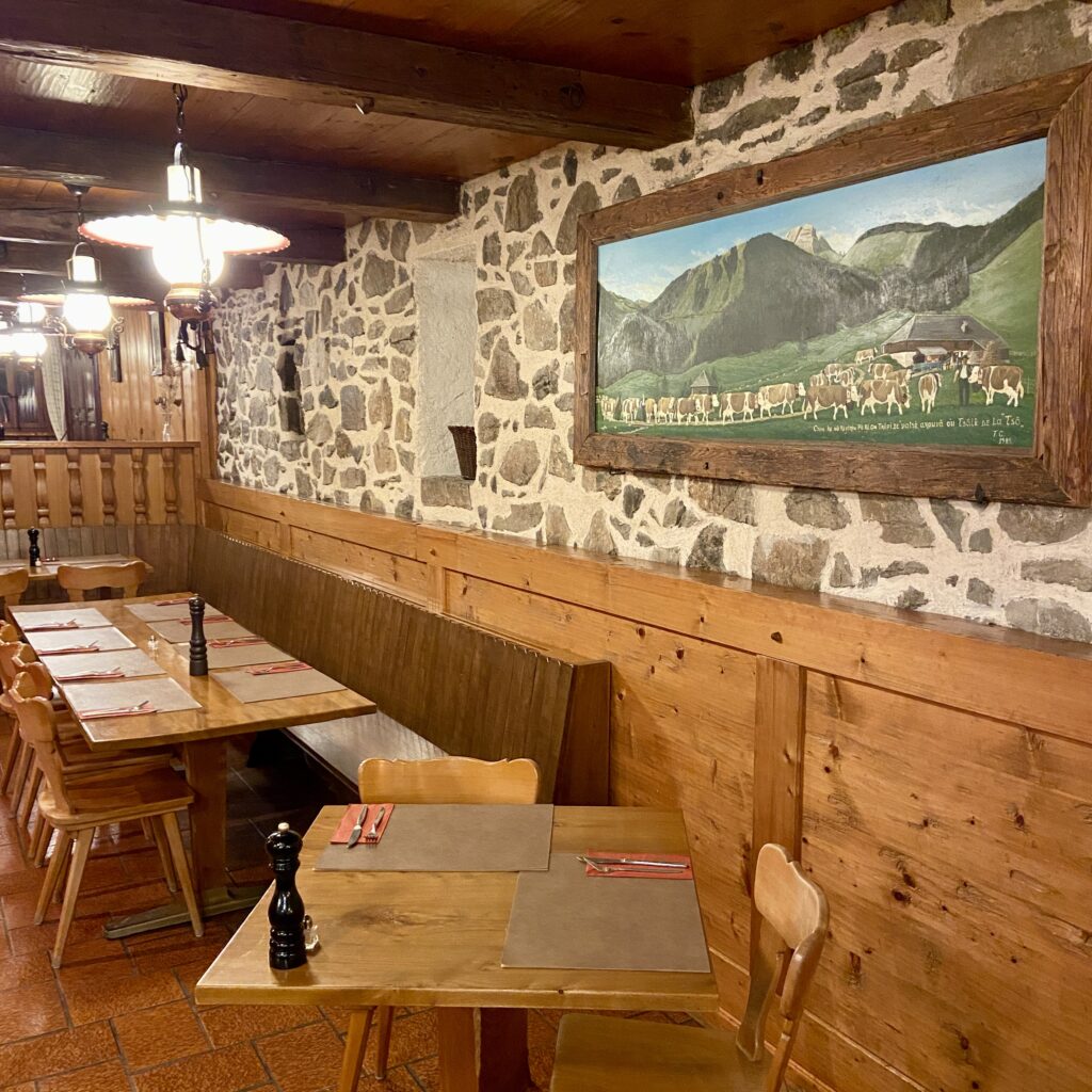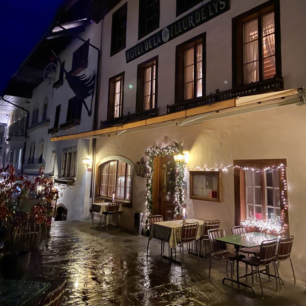 The restaurant at La Fleur de Lys in Gruyères is known for its traditional Swiss cuisine, particularly its exceptional fondues. We ordered the classic Moitié-Moitié fondue which came with both bread and potatoes. It was delicious, and my son enjoyed dipping both his chicken nuggets and fries from the kids menu into the fondue. We also tried the beef which we cooked tableside in a delicious butter. The restaurant is child friendly with baby chairs and a baby changing table. Reservations are recommended using their website. There are several paid parking lots outside of the medieval city. The old cobblestone streets are pedestrian friendly and fun for the children to explore.