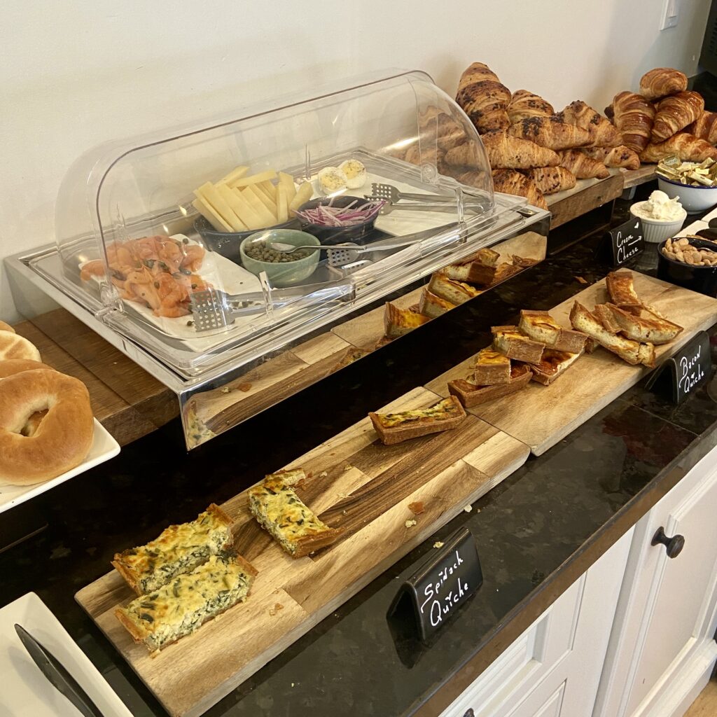 Breakfast is included with your stay and features a buffet spread of fruits, pastries, meats, cheeses, cereals, yogurts, and beverages like juice, coffee, and tea. The dining room is small, but on sunny mornings, the outdoor patio is a great choice. For lunch and dinner, the on-site Nella Kitchen & Bar serves delicious pinsas (similar to pizzas), pastas, and salads for lunch and dinner. Guests may bring their own bottle of wine for a corkage fee. Reservations are recommended and can easily be made online. In the evenings, the fire pits and outdoor seating areas on the lawn offer a relaxing space to unwind with a glass of wine.