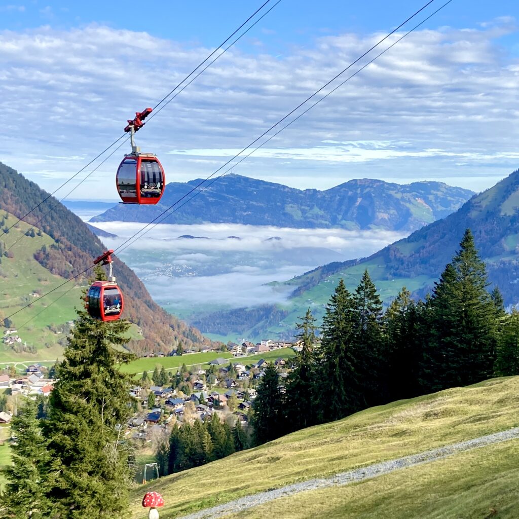 One of the highlights of a family trip to Wirzweli is the Witch Trail (Hexenweg). To reach the trailhead, follow signs to the smaller cable car that takes you up to Gummenalp. Since this lift only holds six people at a time, we recommend starting your day here to avoid long waits. Tickets must be paid in cash at the Gummenalp top station. The Hexenweg is a 3.2 km, mostly downhill hike, suitable for children aged four and up (but not stroller-friendly). Along the way, benches offer convenient snack stops while you enjoy panoramic mountain views. Kids will love the interactive witch-themed stations, like the broomstick zip line, spider webs, and Lizi’s little house. At the end, children can even collect a colorful “magic stone” as a souvenir of their adventure. This trail is particularly special in autumn and makes for an unforgettable family Halloween outing. It took our family 1.5 hours to complete the trail. For more detailed information on this hike, click here.